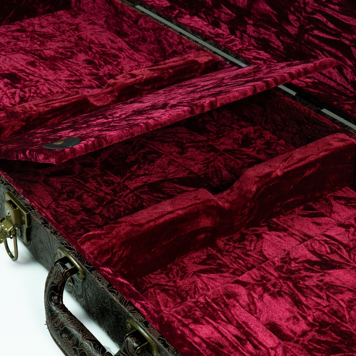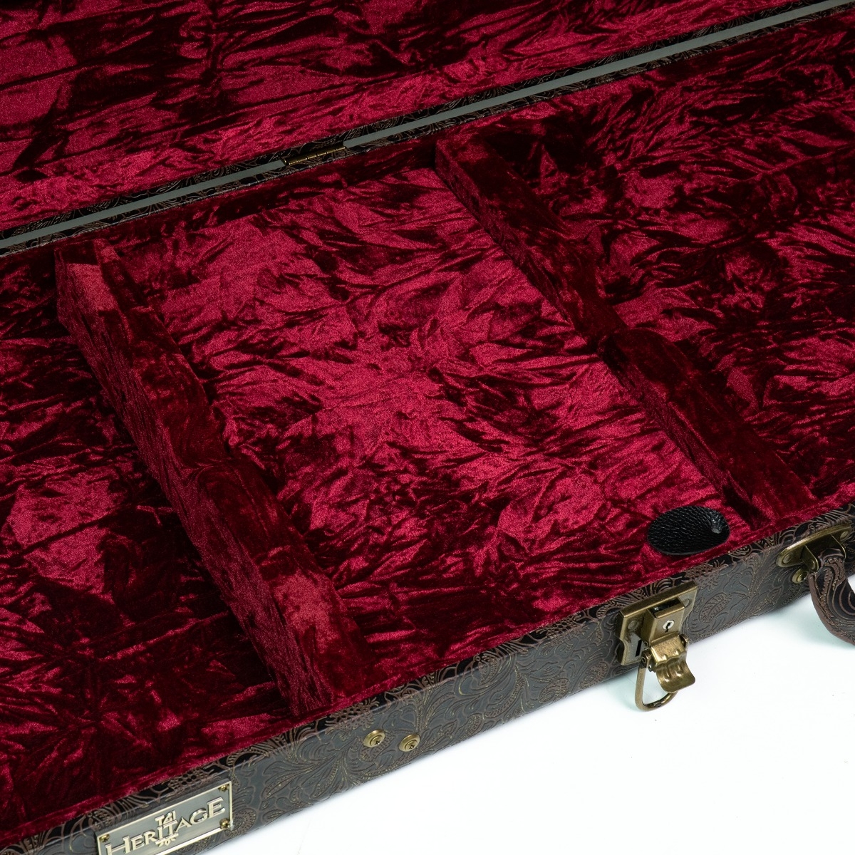 Visually, the Heritage case stands apart. The exterior is wrapped in an ornate embossed faux leather finish, featuring a detailed floral/petal pattern that evokes classic vintage luggage aesthetics. Antique Gold-tone hardware - including secure latches and a locking clasp - adds both visual sophistication and practical security.